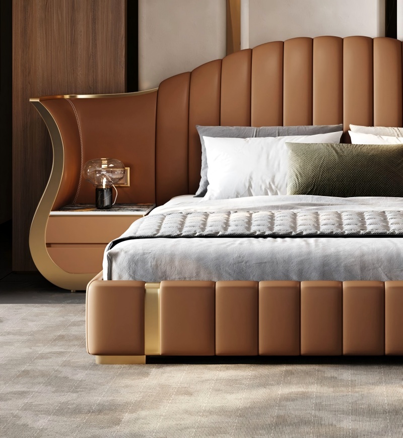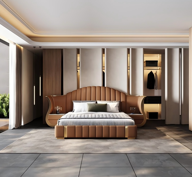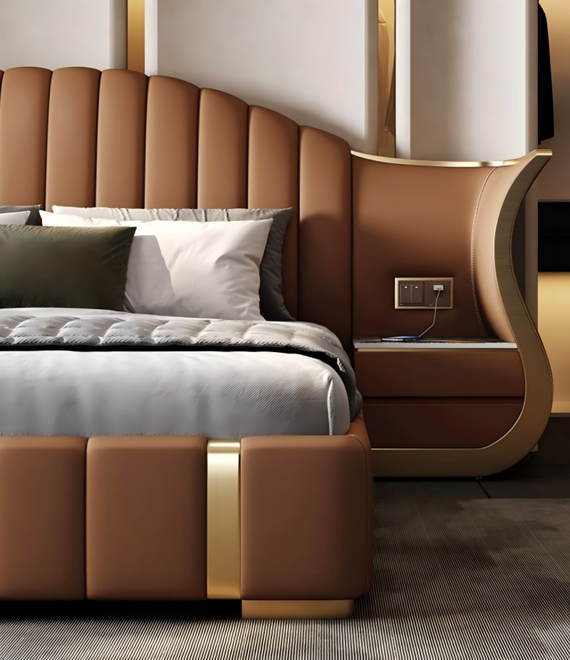 เตียงขนาดใหญ่ที่ได้รับการออกแบบอย่างสง่างามนี้ได้รวมโต๊ะข้างเตียงสองด้านเข้าด้วยกัน มันทำจากวัสดุที่มีคุณภาพสูง [ไม้เนื้อแข็ง/หนัง/ผ้า] หัวเตียงที่กว้างขึ้น 1.8 เมตรจับคู่กับตู้เก็บของสมมาตรซึ่งไม่เพียง แต่ตรงกับความต้องการการจัดเก็บก่อนเข้านอน แต่ยังสร้างความสวยงามของพื้นที่กลมกลืน