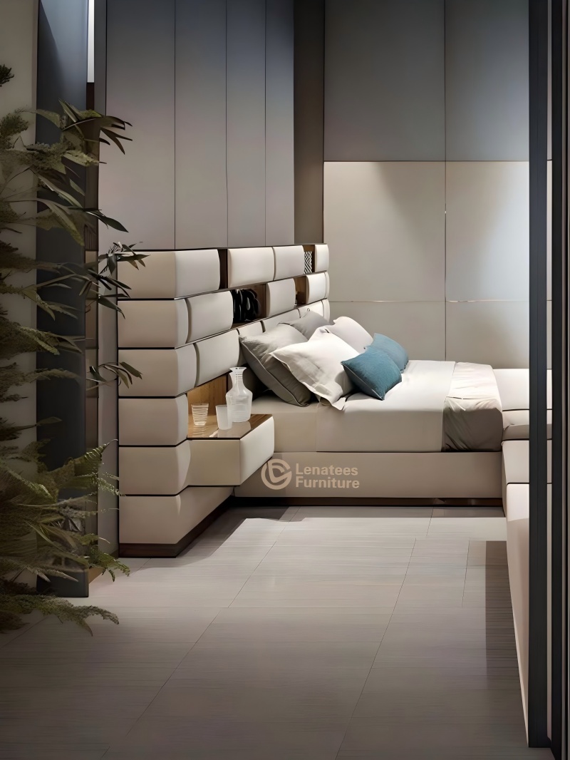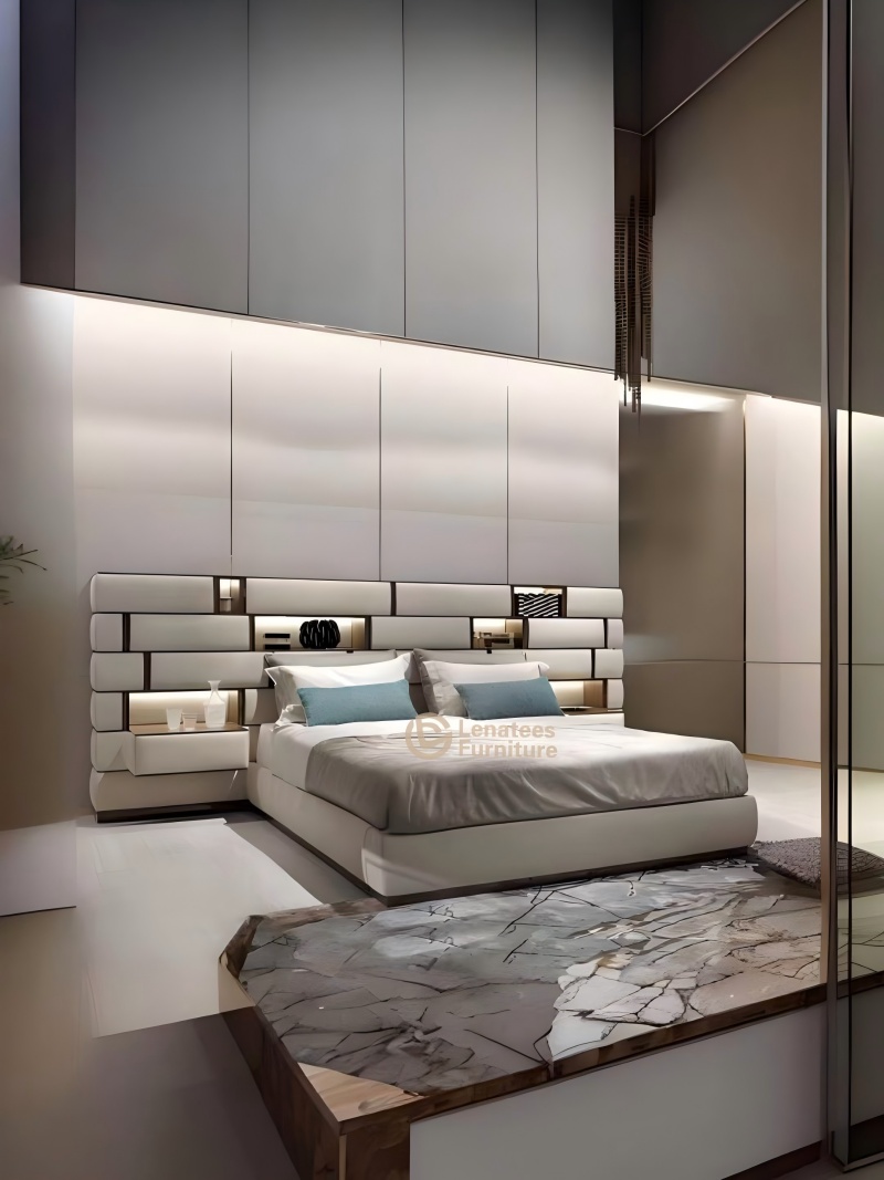 ฮาร์ดแวร์ชุบโครเมี่ยมสแตนเลส 304 ตัวที่เลือกรวมกับถุงเนื้อนุ่ม/กำมะหยี่ที่นำเข้ามาเพื่อสร้างตัวเอกในห้องนอนที่ผสมผสานพื้นผิวอุตสาหกรรมเข้ากับประสบการณ์ที่สะดวกสบาย